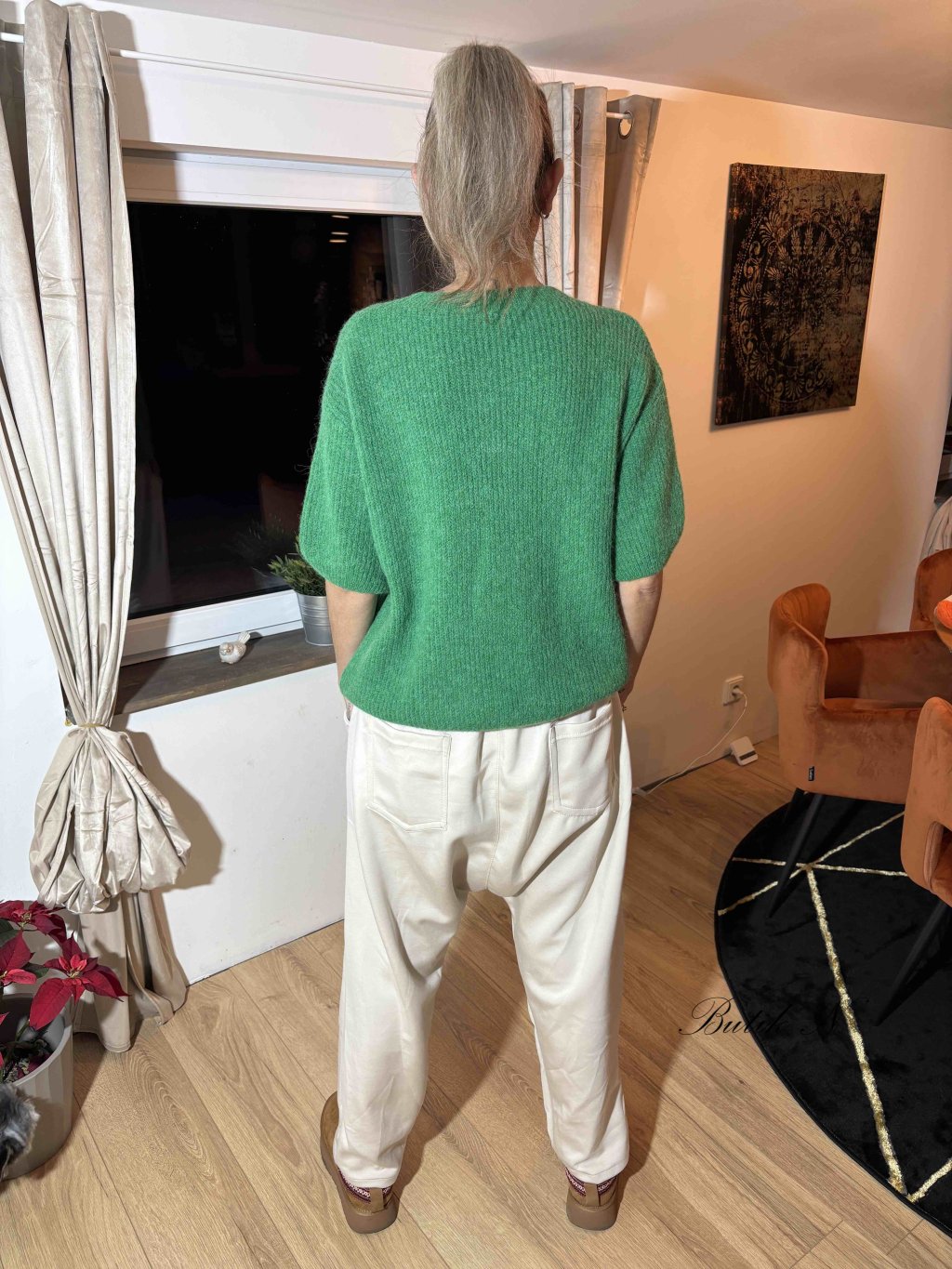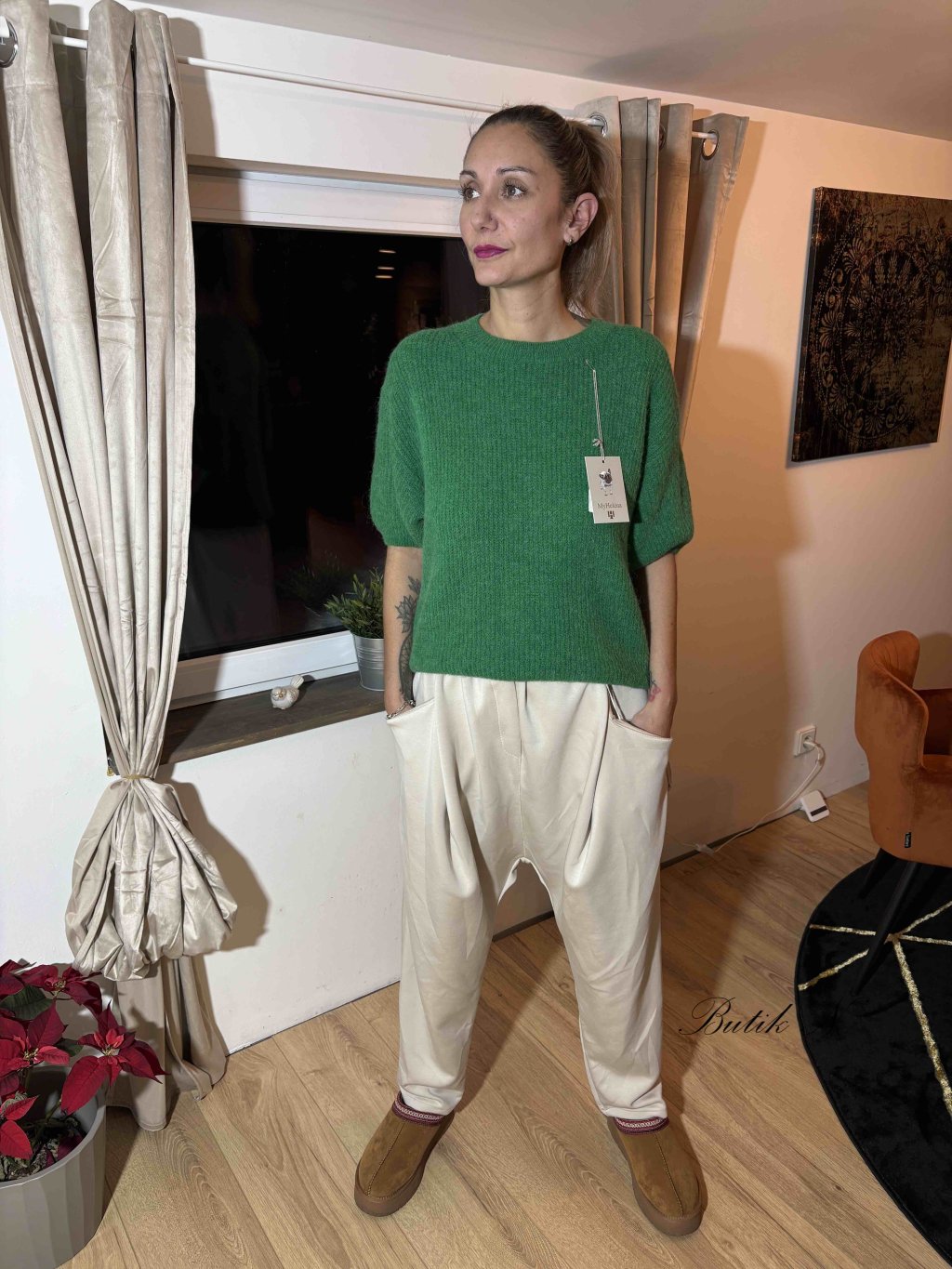 Kalhoty ve stylu baggy s máslového materiálu s gumou v pase, předními i zadními kapsami a páskem.