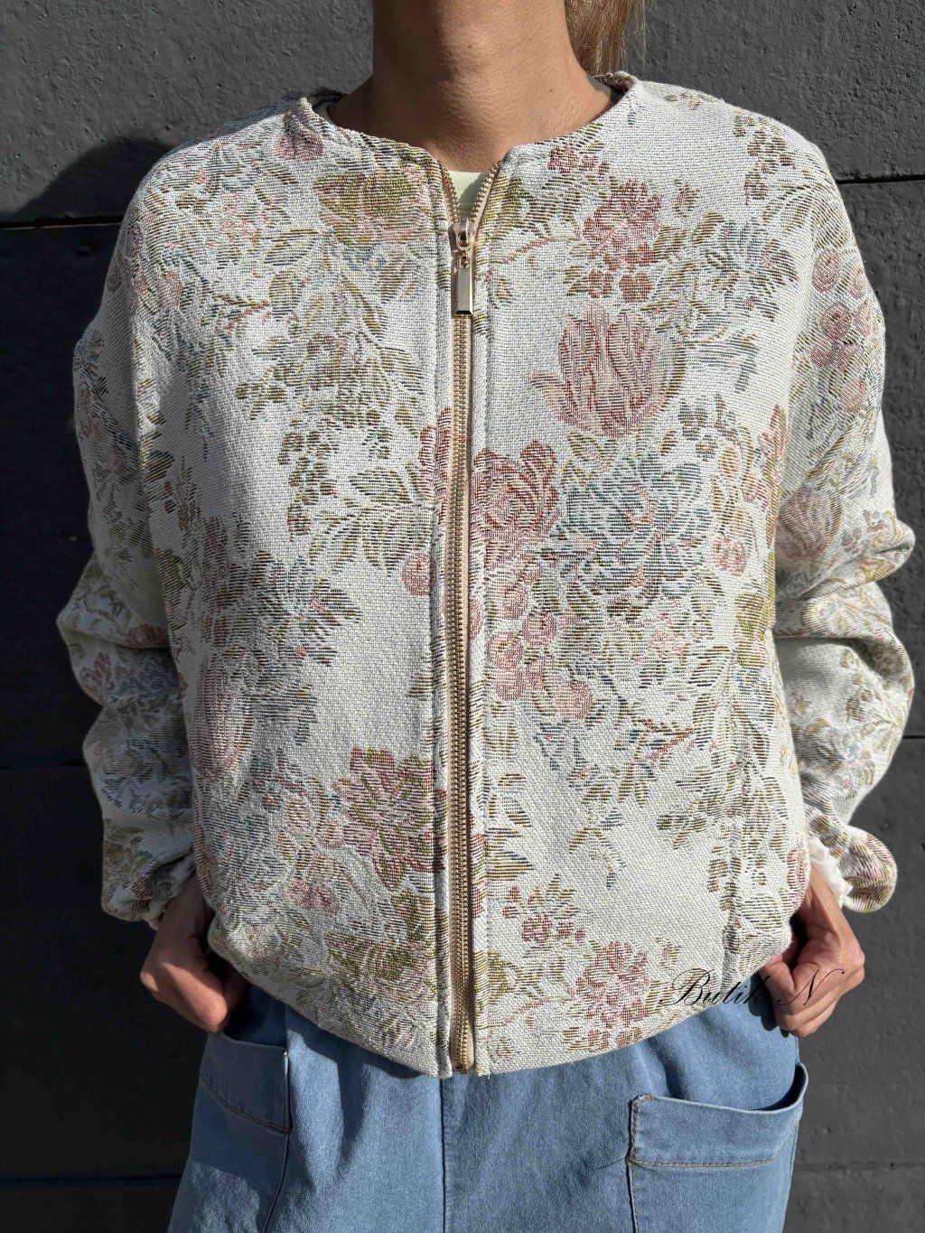 Podšitá bomber bundička z kvalitního materiálu s jemným motivem, zapínáním na zip, předními kapsami a gumičkami ve spodním lemu bundy a rukávů.