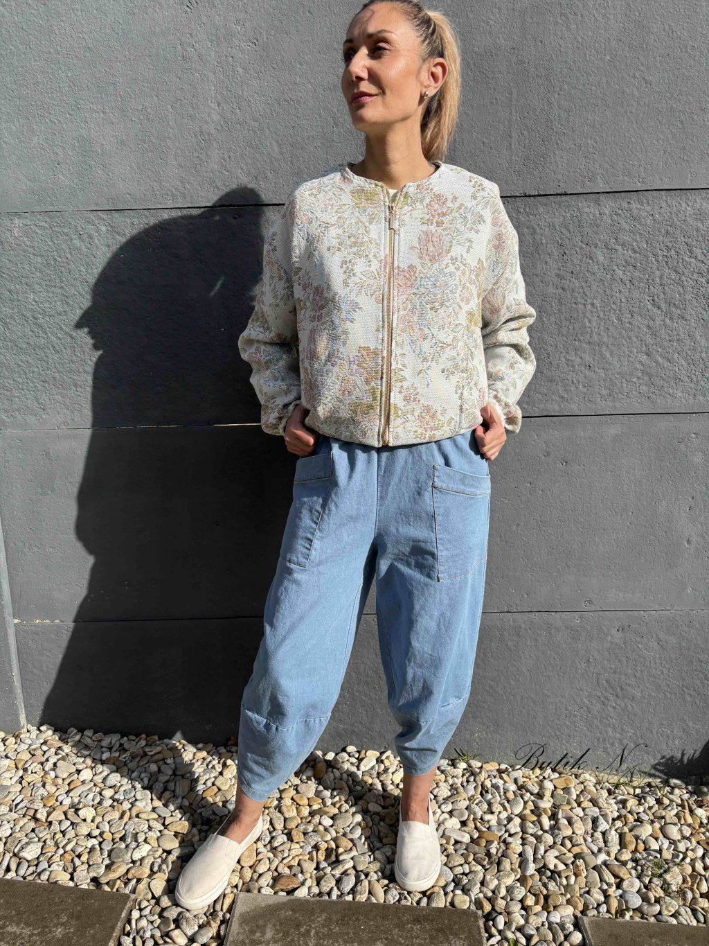 Krásná, lehká bunda s velmi moderním vzorem a zapínáním na druky.