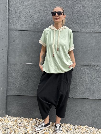 Lehké kalhoty s širokou gumou v pase (žabičkování), které jsou parádním kouskem na léto.