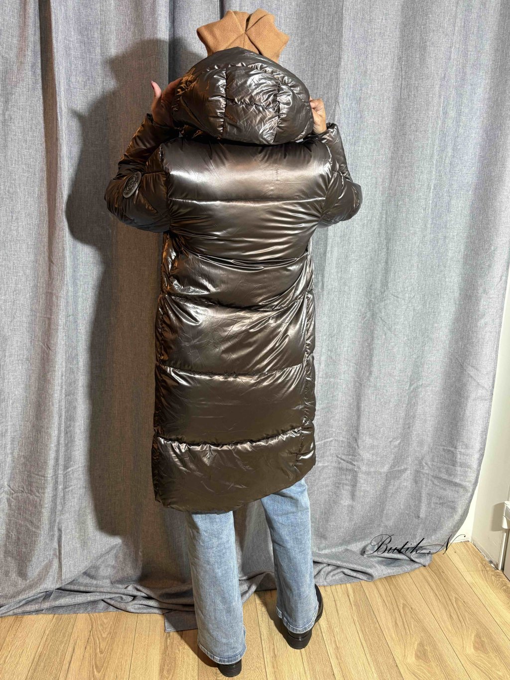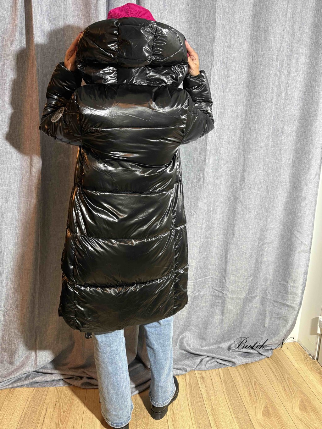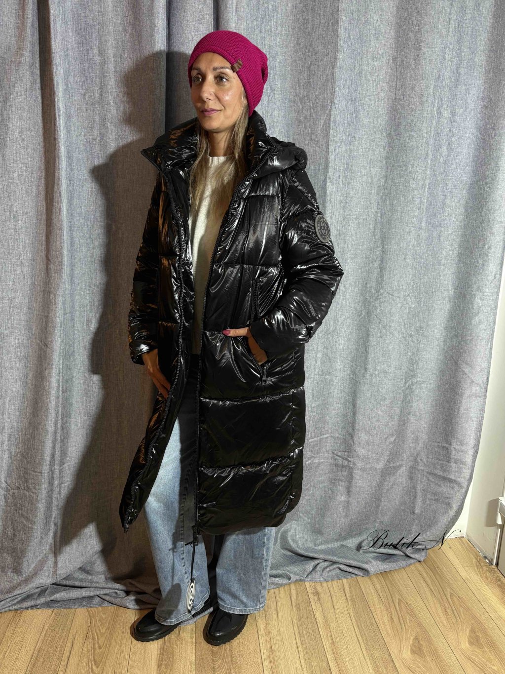 Dlouhý zimní kabát v lesklém provedení, se zapínáním po celé délce na zip, kapsami a gumovou nášivkou na rukávu.