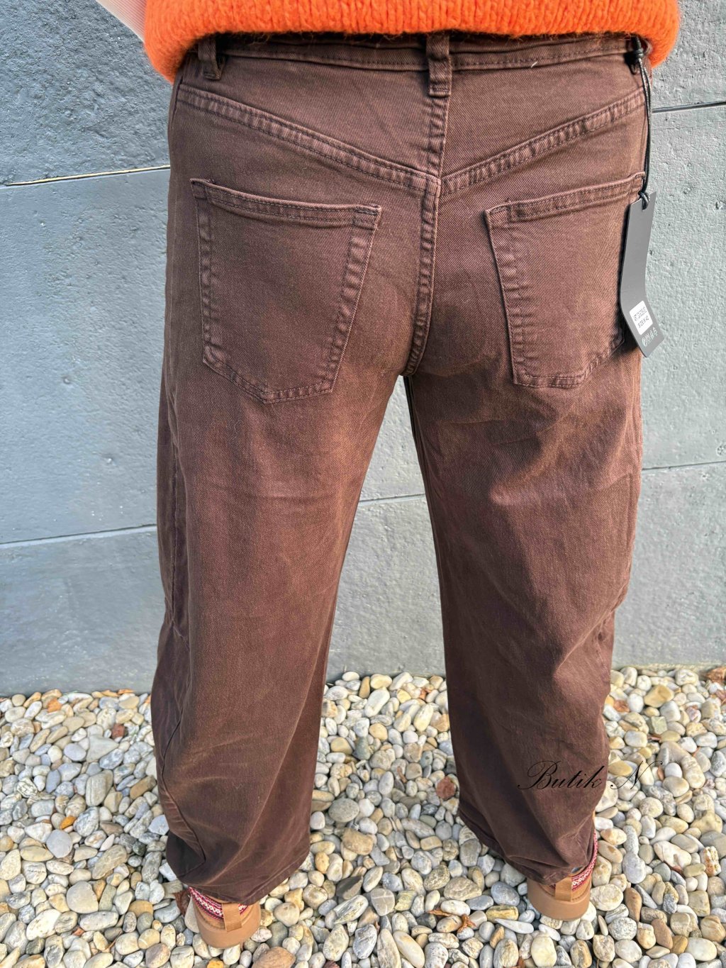 Dokonalé džíny banánového střihu v krásné čokoládové barvě barvě z velmi měkké a pružné džínoviny, s předními i zadními kapsami, zapínáním na zip a knoflík.