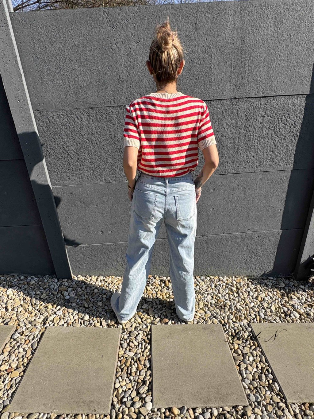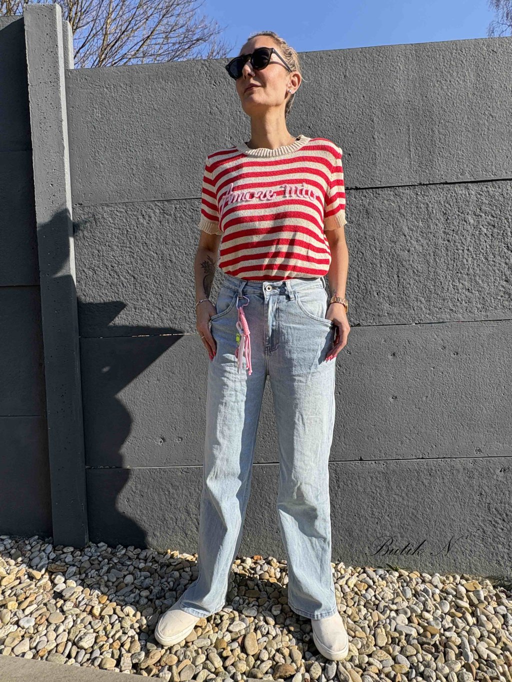 Kvalitní triko z úpletu s vyšitým srdíčkem a stříbrnou nitkou v proužku.Sytost barvy produktu se může lehce lišit s ohledem na světlo v ateliéru nebo rozlišení Vašeho zařízení.