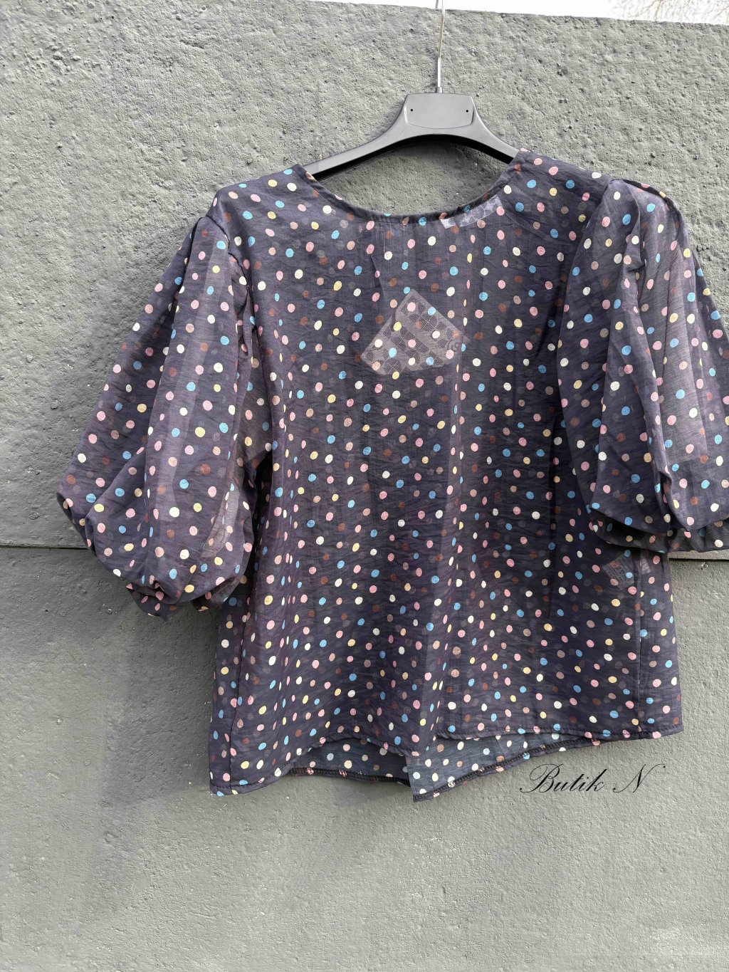 Lehká halenka s balónovými rukávy a zapínáním na knoflíky na zádech.