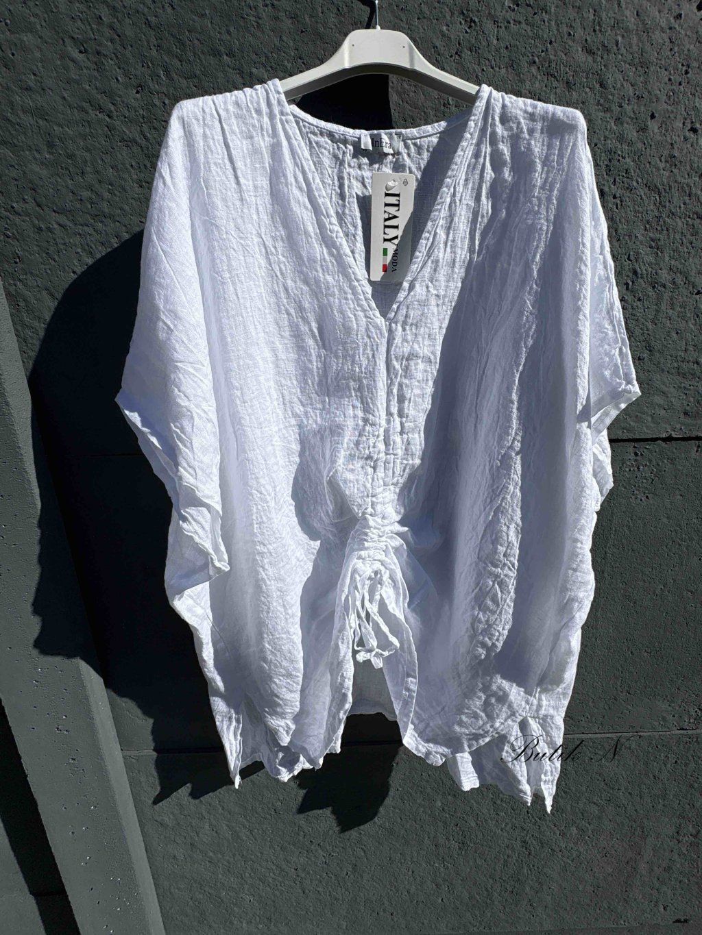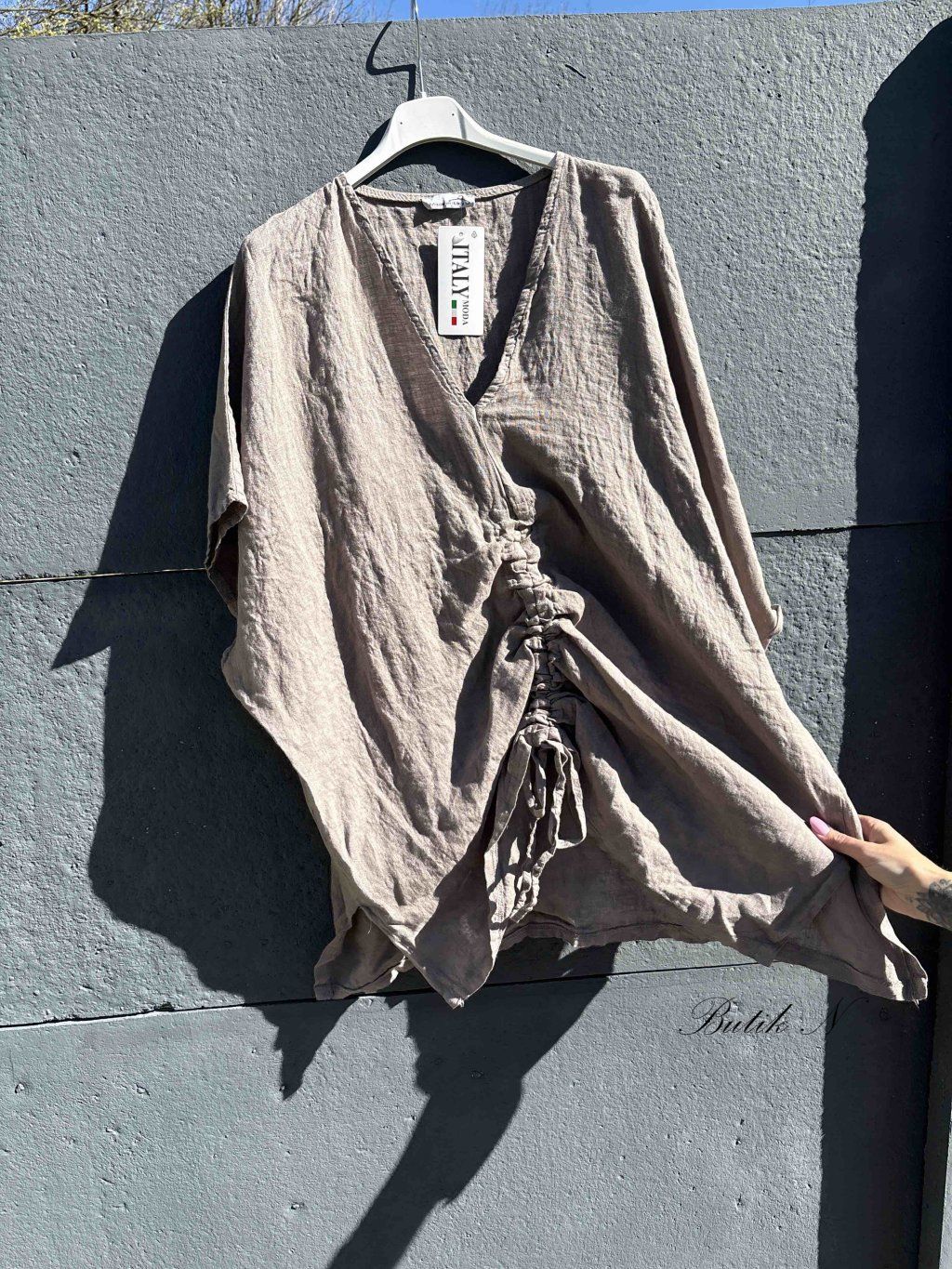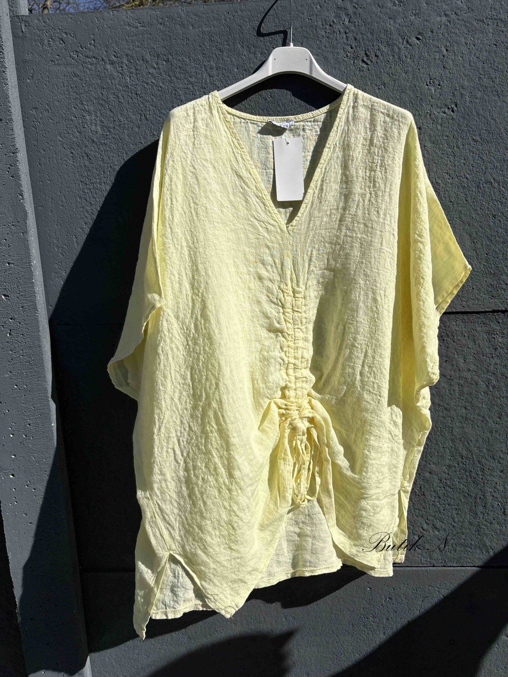 Kvalitní, lněná halenka, kterou lze vepředu upravit dle potřeby s krátkým rukávem.