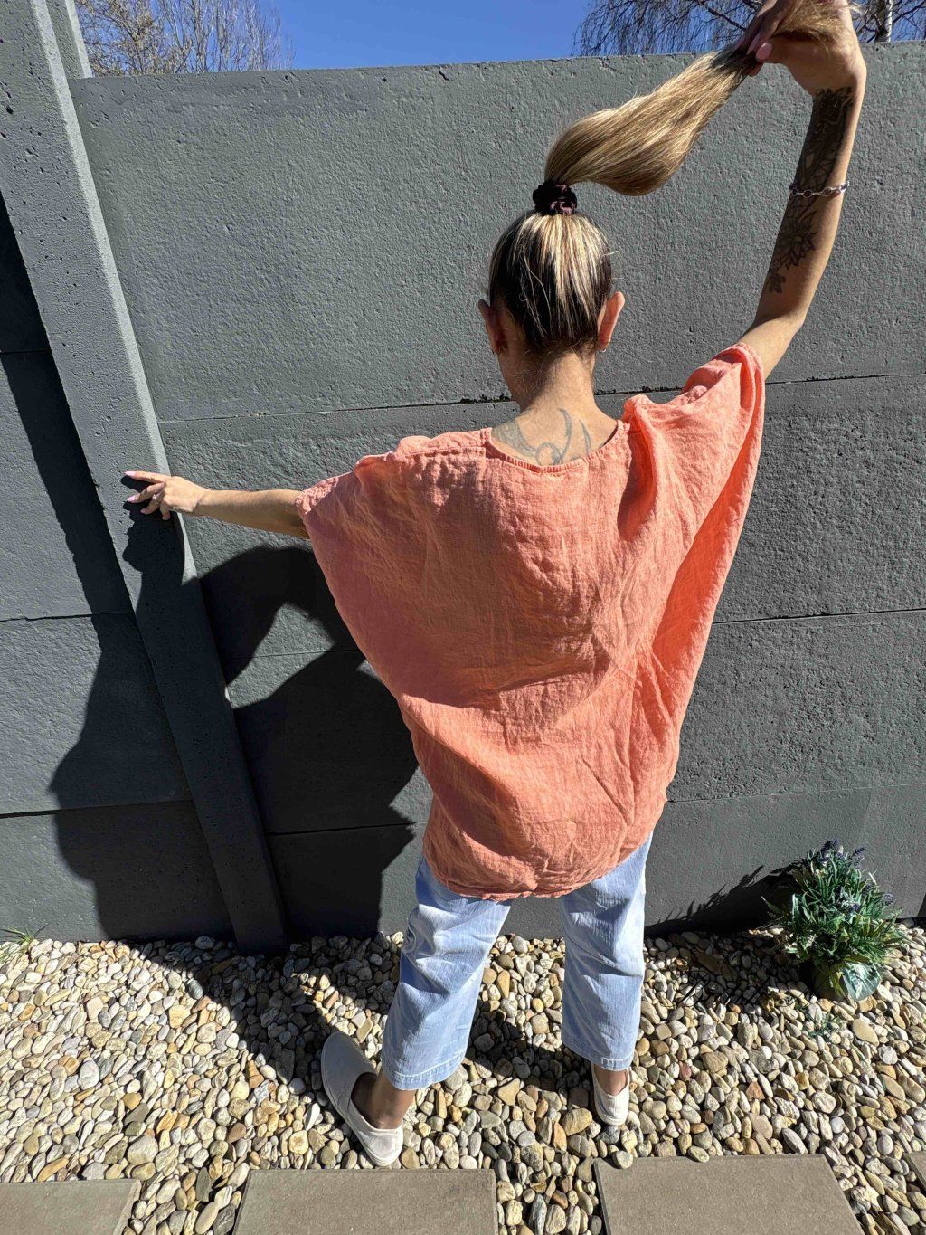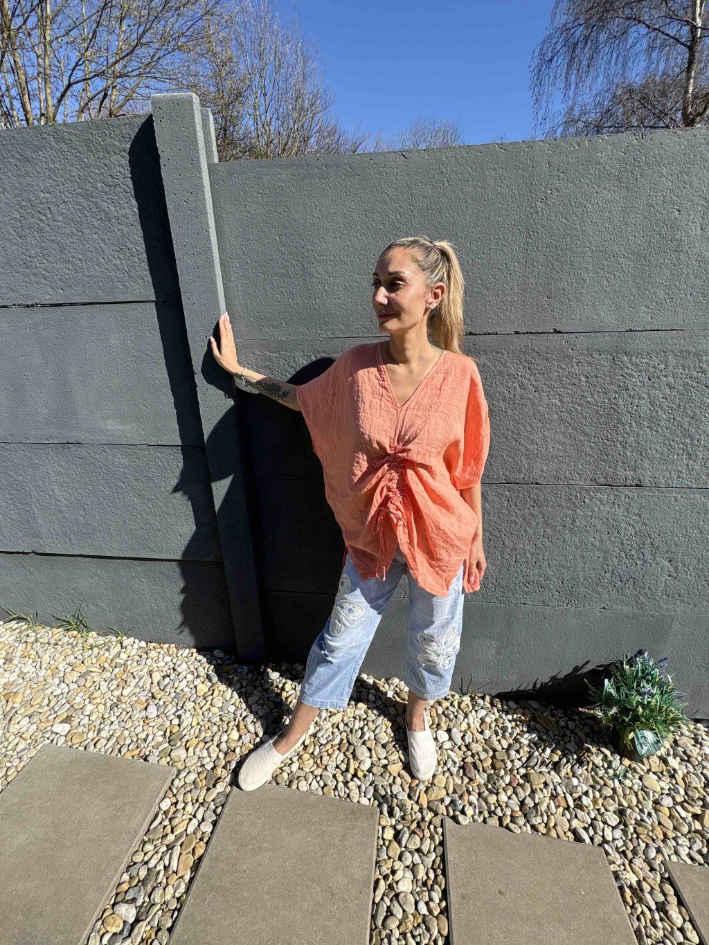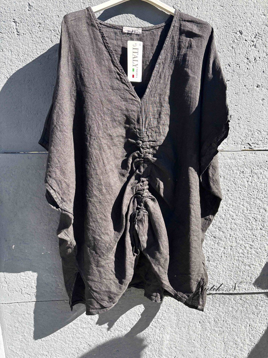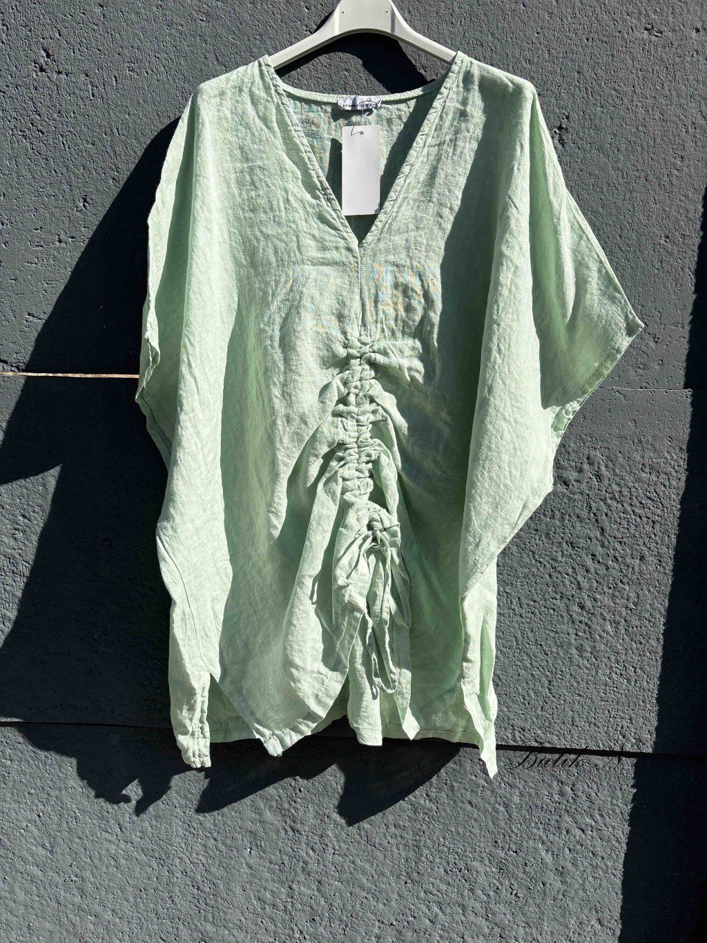 Kvalitní, lněná halenka, kterou lze vepředu upravit dle potřeby s krátkým rukávem.