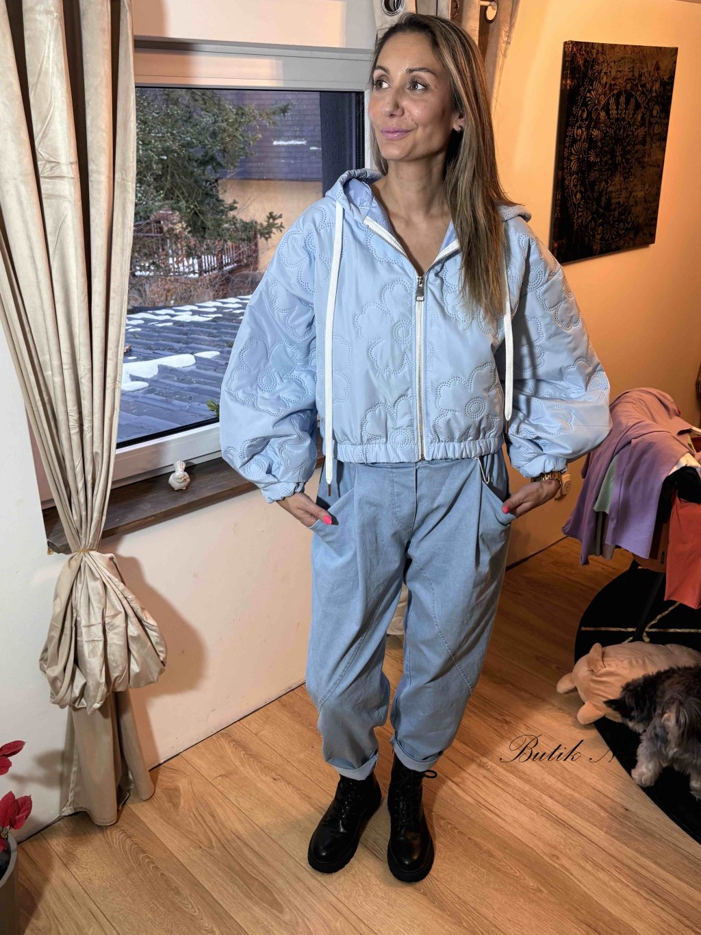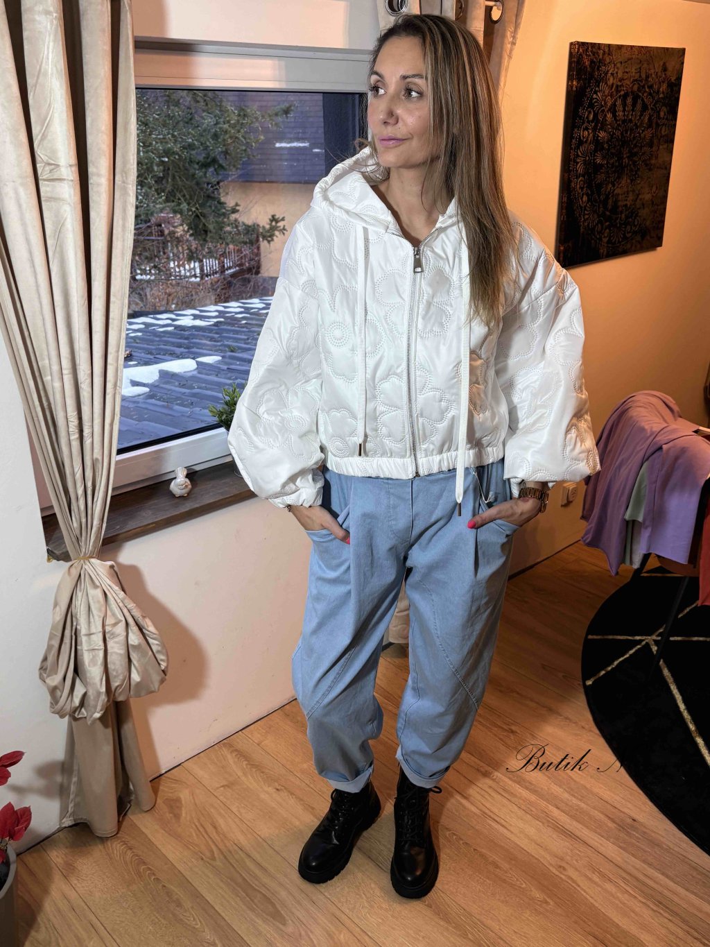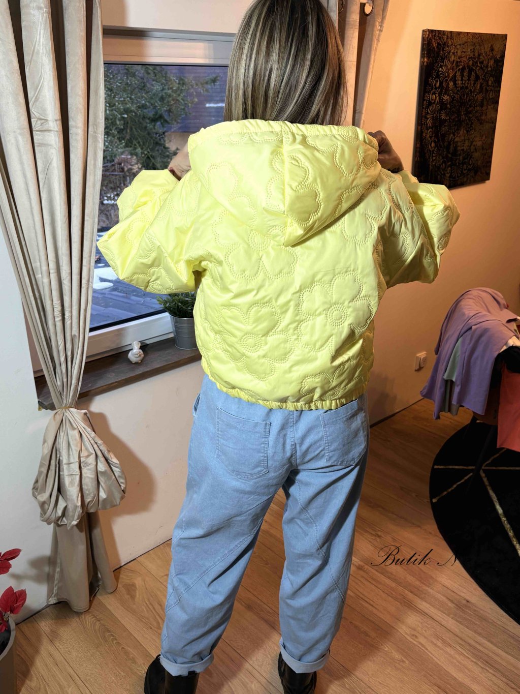Kvalitní, jarní bunda s balónovými rukávy, kapsami, zapínáním na zip a kapucí. Rukávy a spodní lem bundy jsou zakončeny gumičkami a květinový vzor je na bundě „vyřezané‟.