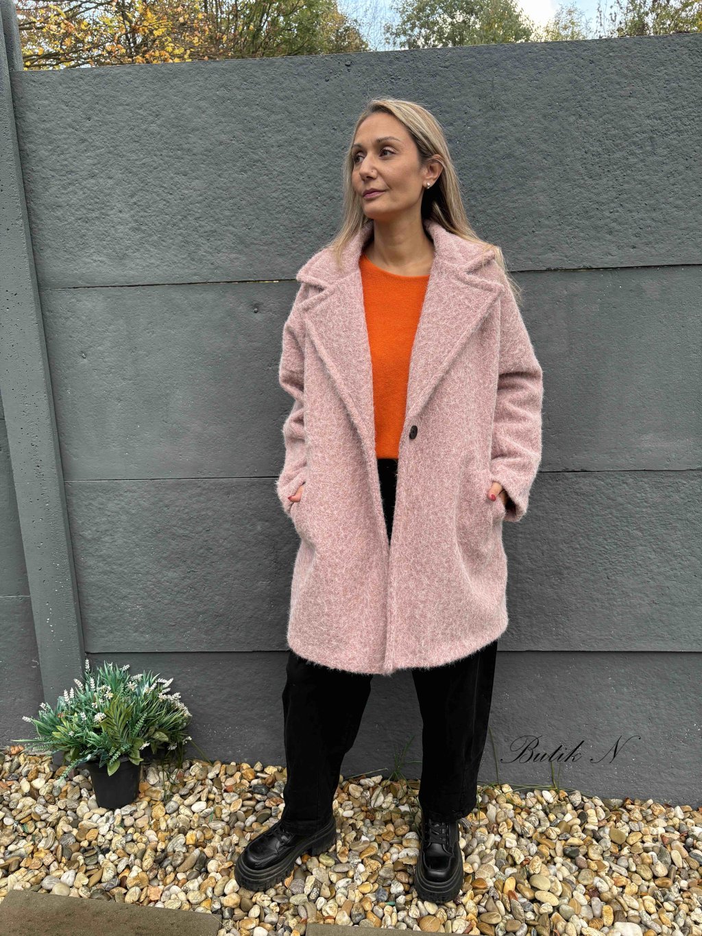 Flaušový kabátek se zapínáním na knoflík, páskem, kapsami a podšívkou, který unosíš jak na podzim, tak i na zimu.