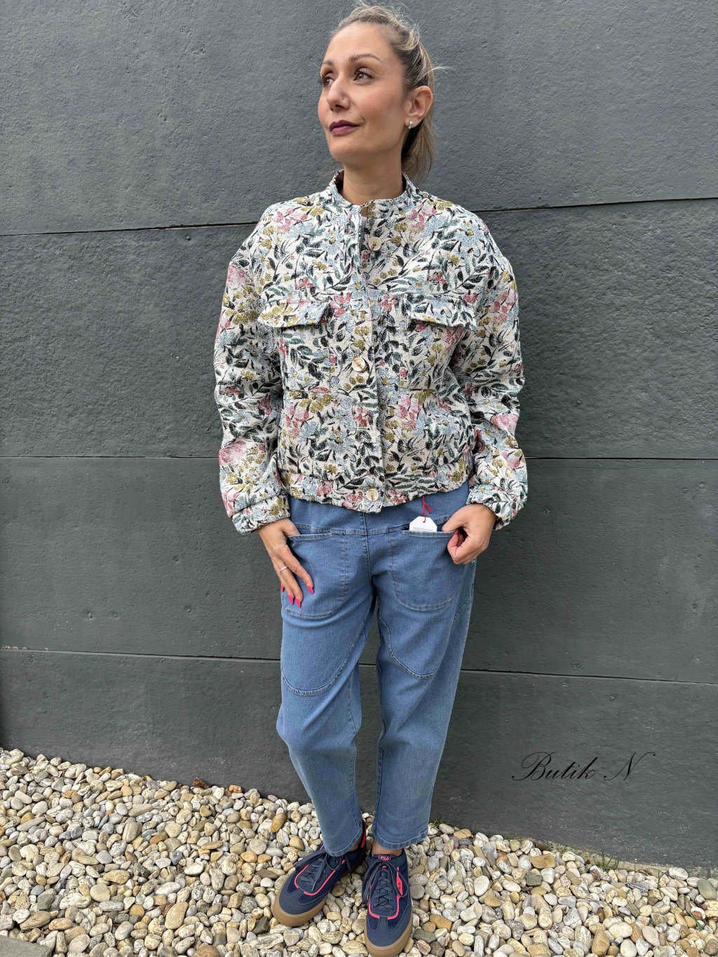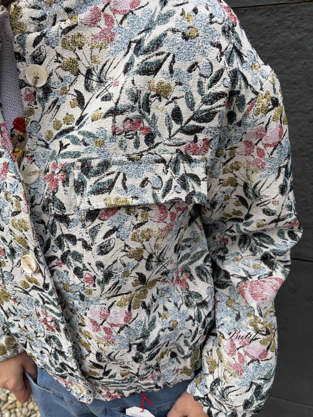 Kabátek z kvalitního materiálu s jemným motivem, zapínáním na knoflíky, předními kapsami a gumičkami ve spodním lemu kabátku a rukávů.