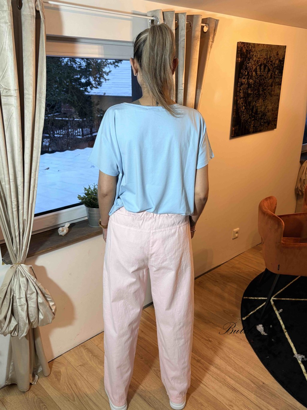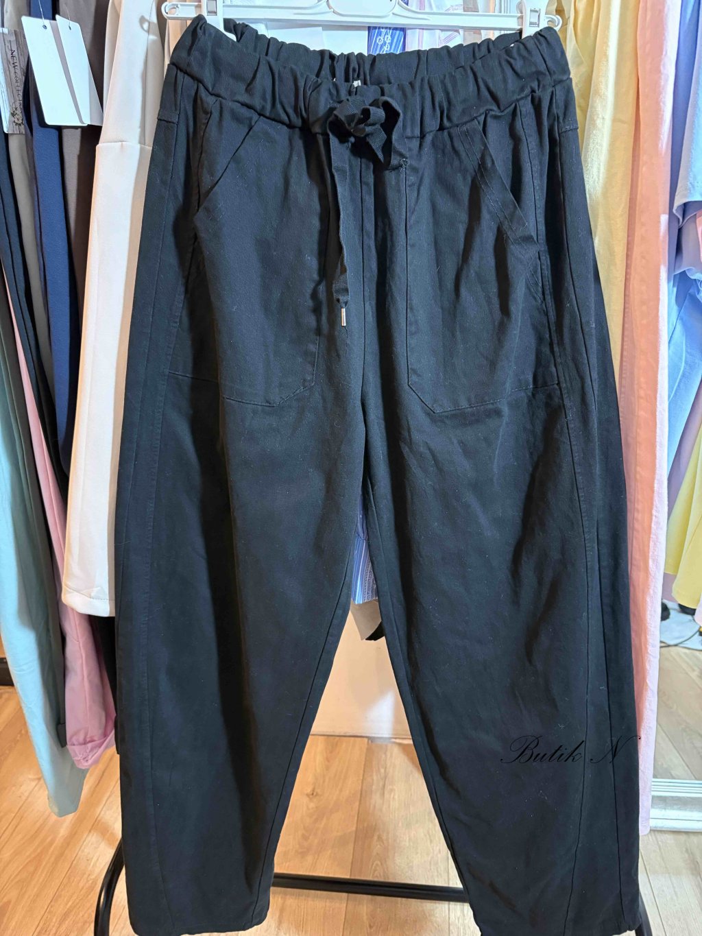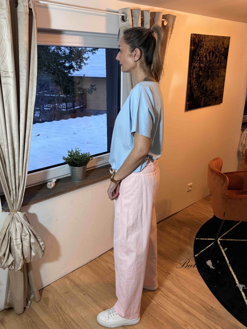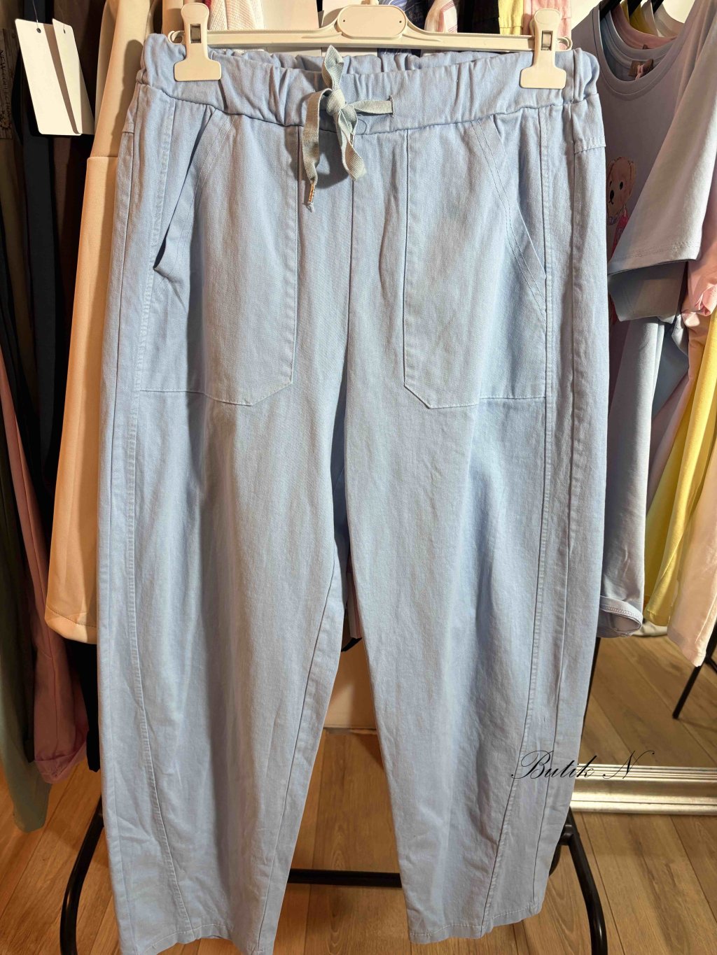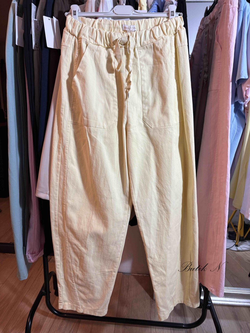 Široké kalhoty, které splývají, z nemuchlavého materiálu. Mají přední kapsy, zadní jsou falešné a pásek je součástí.