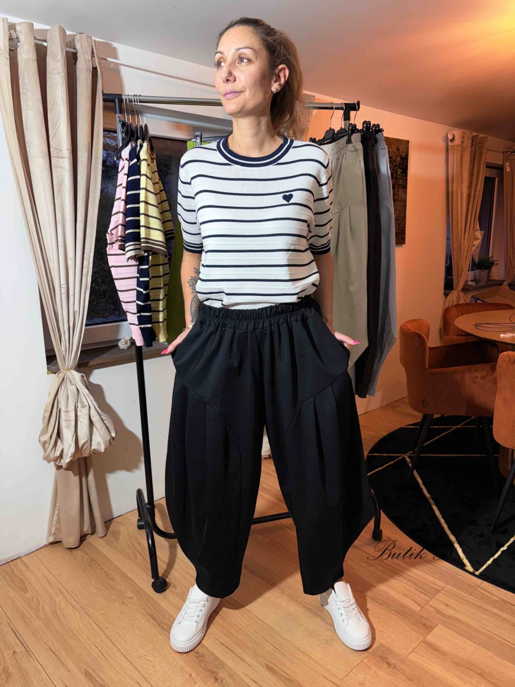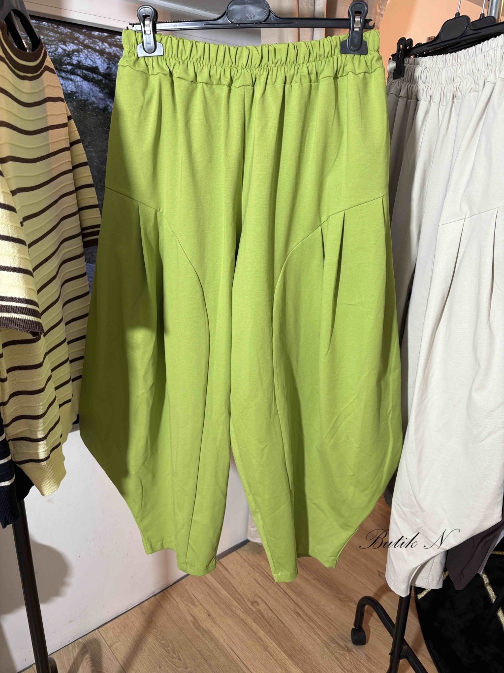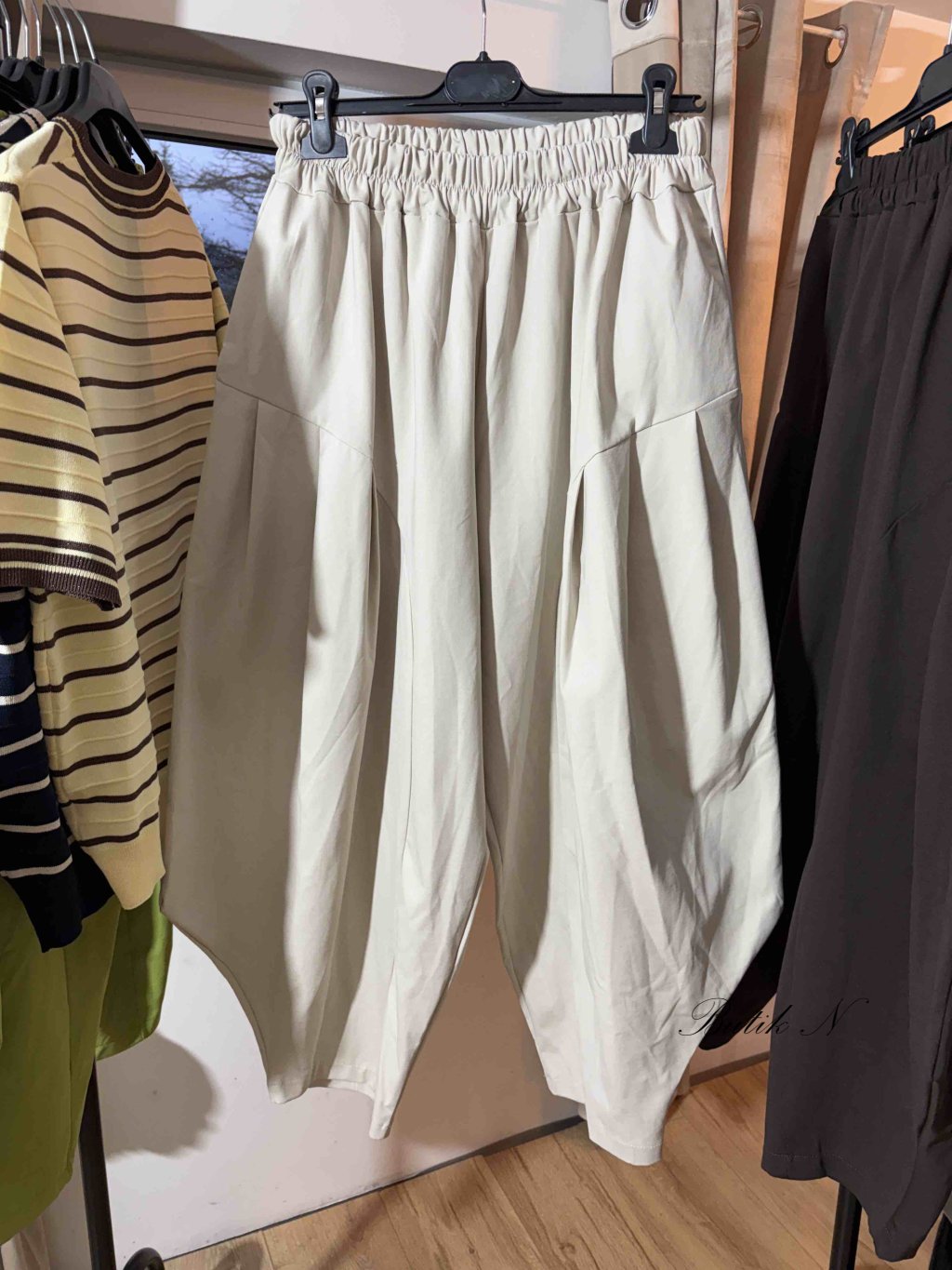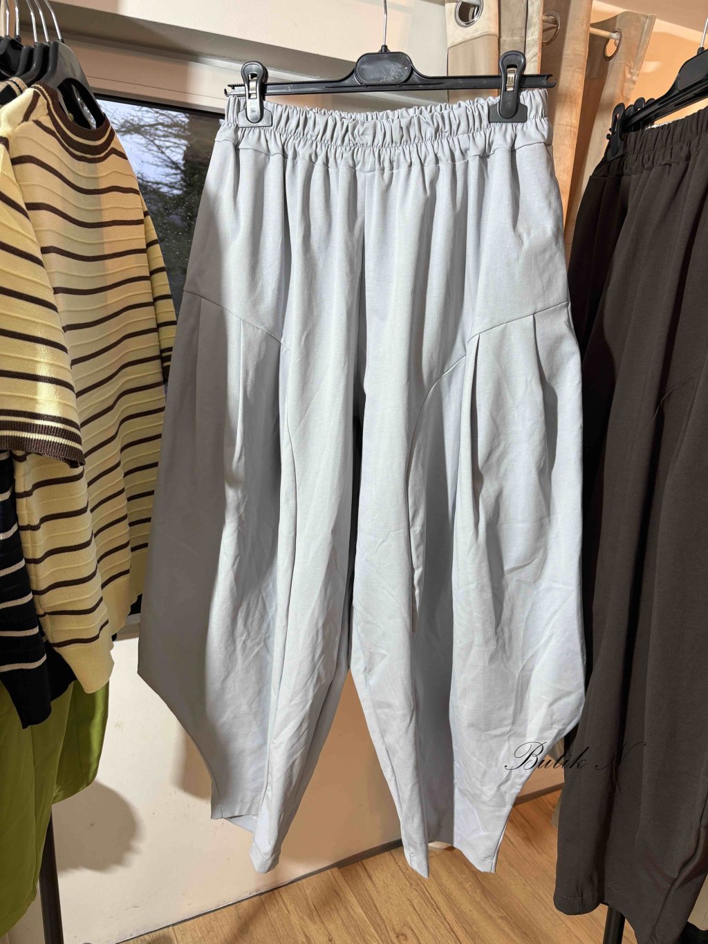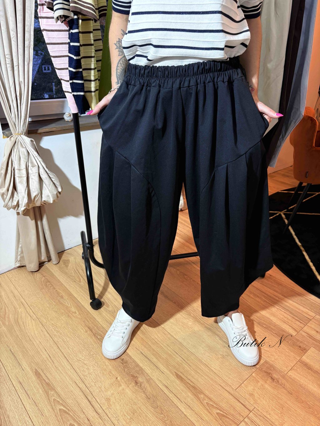 Kvalitní kalhoty balónového střihu z luxusního materiálu se spadlým sedem, gumou v pase a kapsami.
