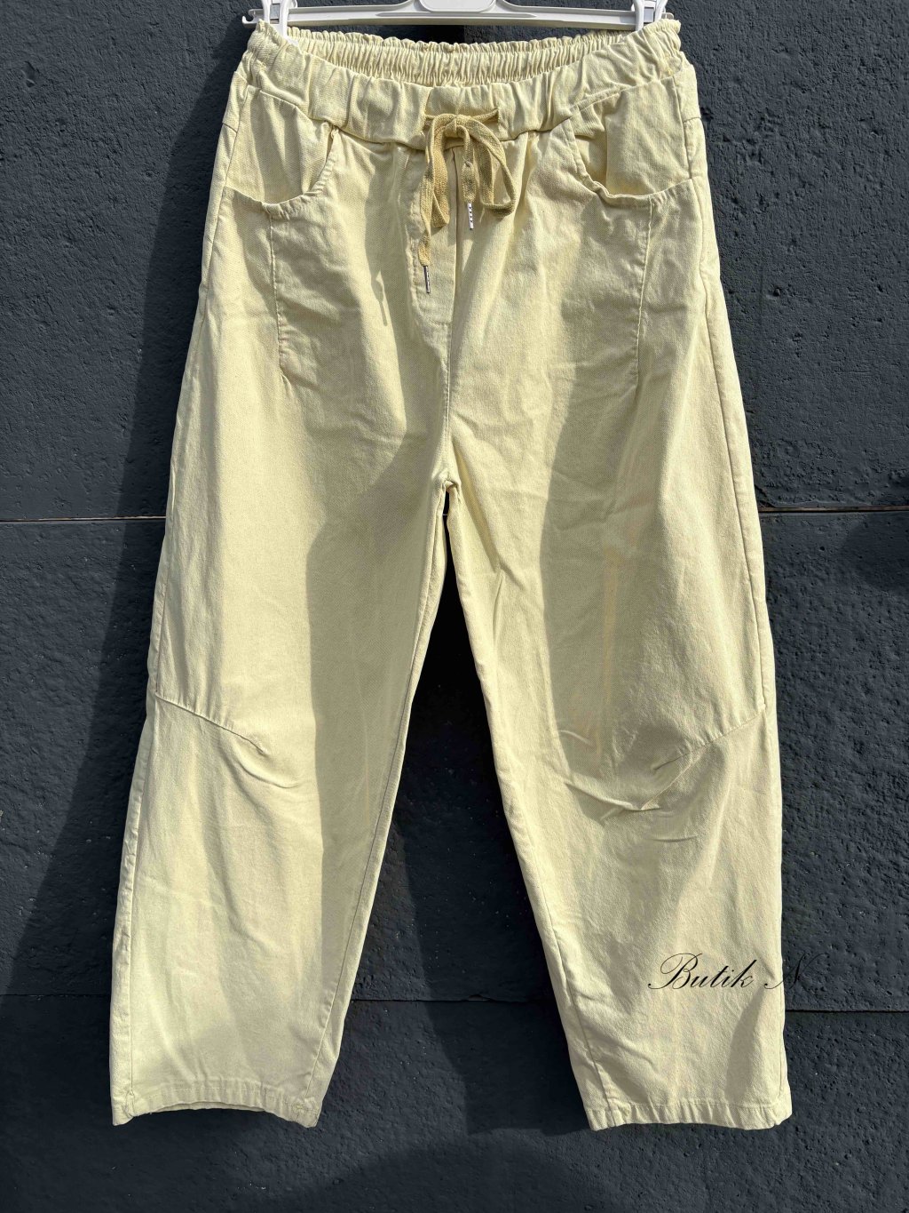 Kvalitní kalhoty balónového střihu s předními i zadními kapsami a gumou v pase.