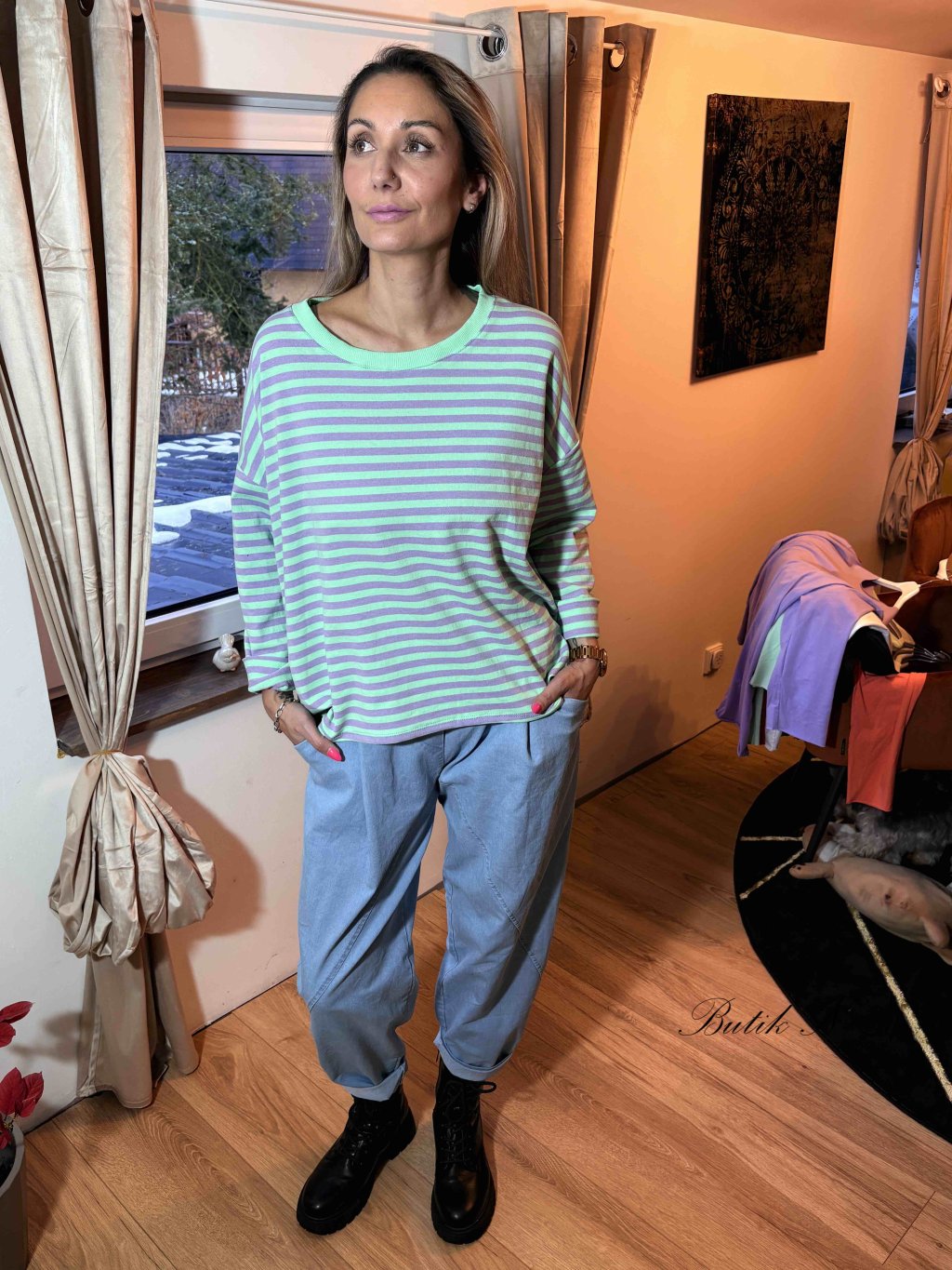 Příjemná mikina z máslového materiálu s 3/4 rukávem a dekorativní všitou cedulkou. Sytost barvy produktu se může lehce lišit s ohledem na světlo v ateliéru nebo...