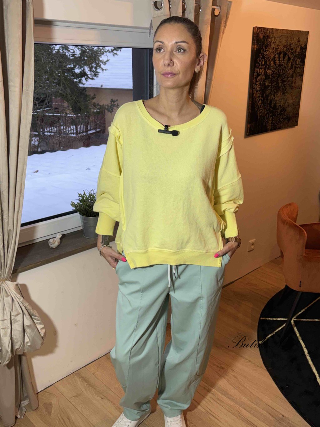Mikinová bundička z máslového materiálu se zapínáním na zip. Sytost barvy produktu se může lehce lišit s ohledem na světlo v ateliéru nebo rozlišení Vašeho zařízení.