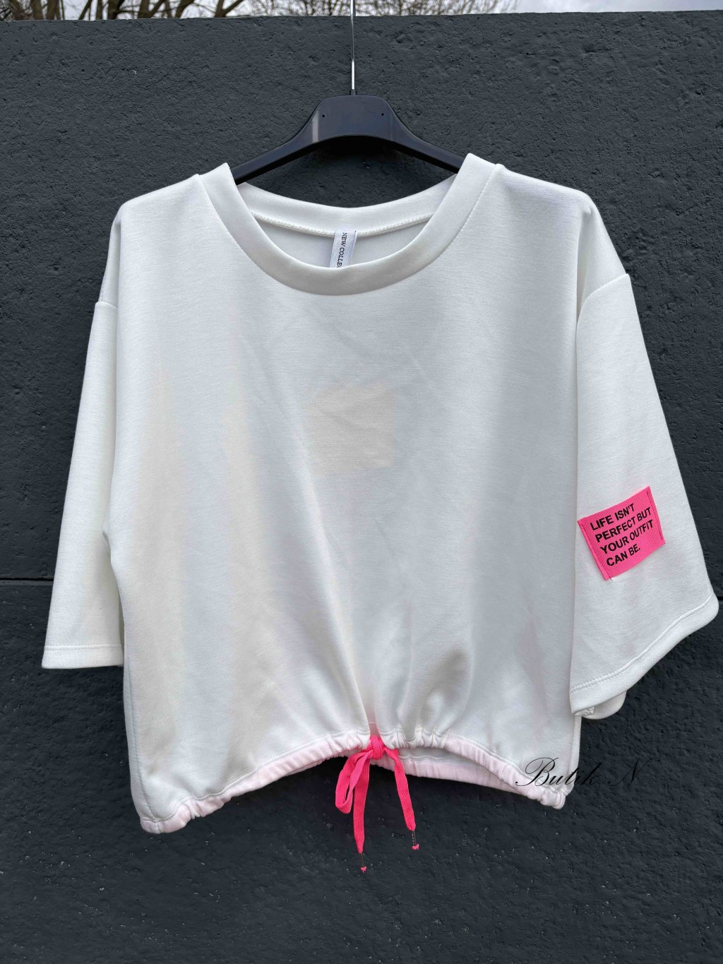 Mikina z příjemného, máslového materiálu s 3/4 rukávem, šňůrkou ve spodním lemu ke stažení a dekorativní nášivkou.