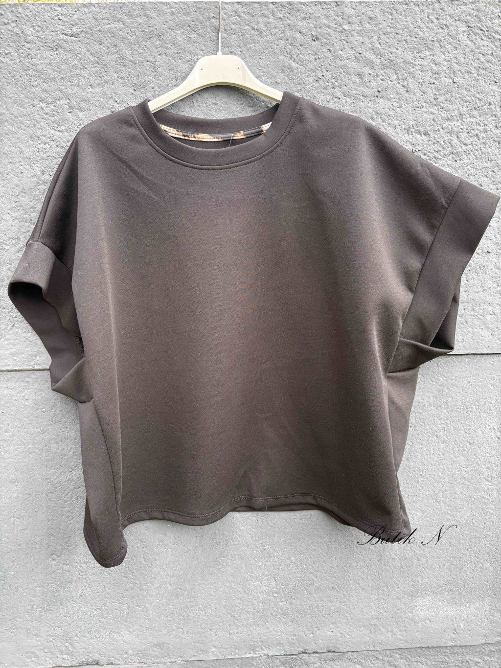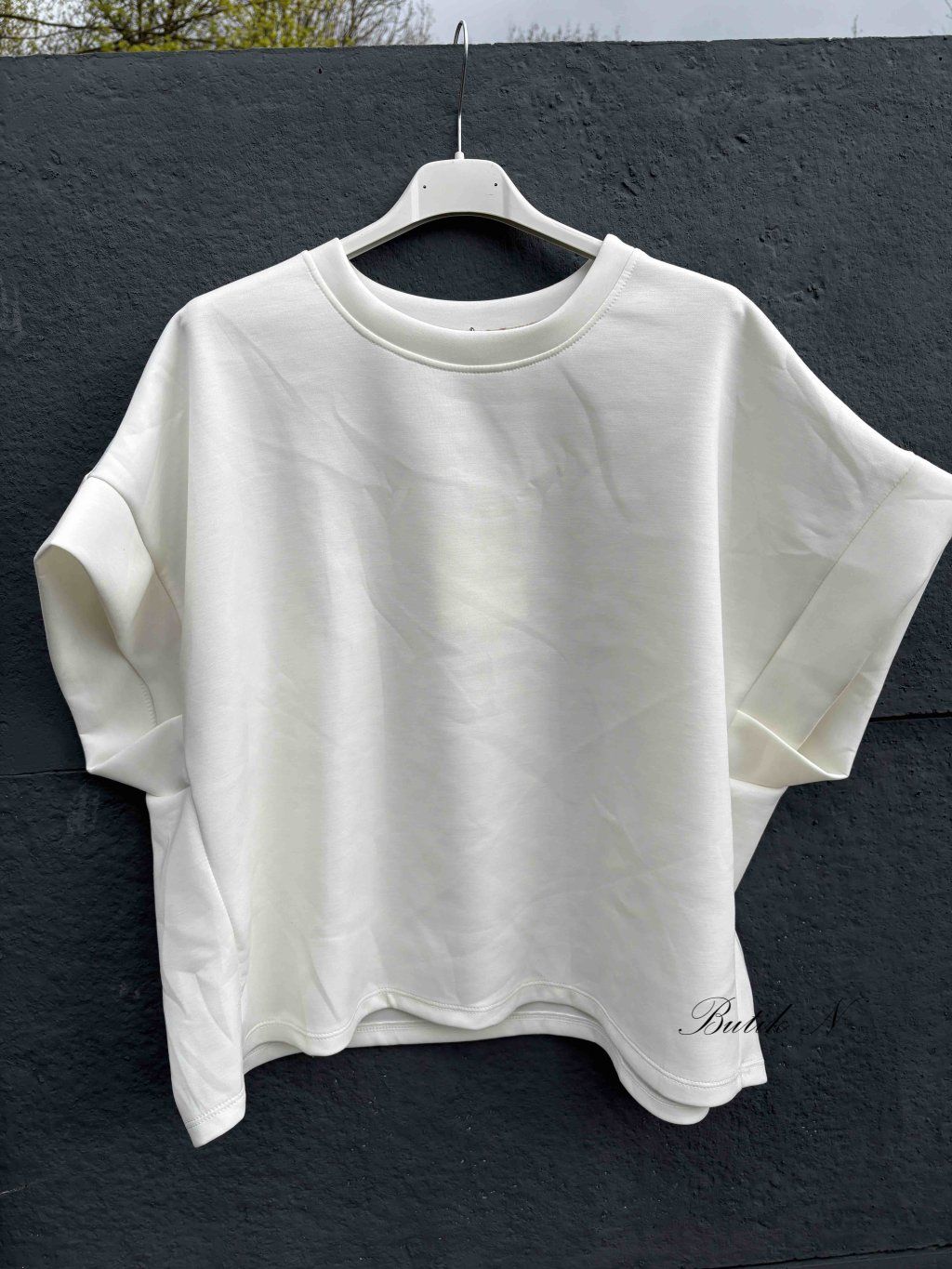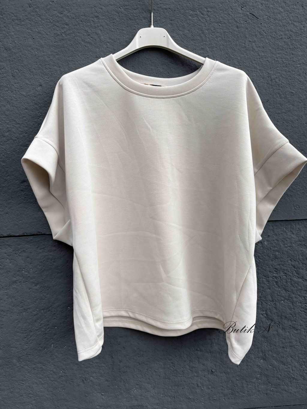 Příjemná mikina, hezkého střihu, z máslového materiálu s krátkým rukávem.