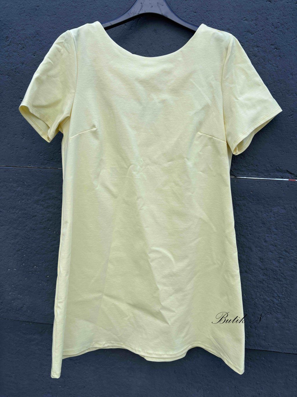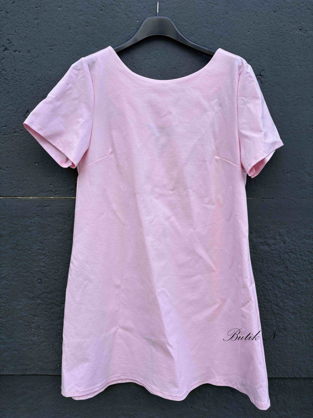 Jednoduché šaty střižené mírně do áčka s mašlí na zavázání na zádech.