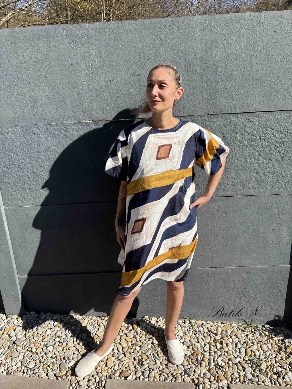 Kvalitní bavlněné šaty se zapínáním na knoflíček na zádech a balónovými rukávy.