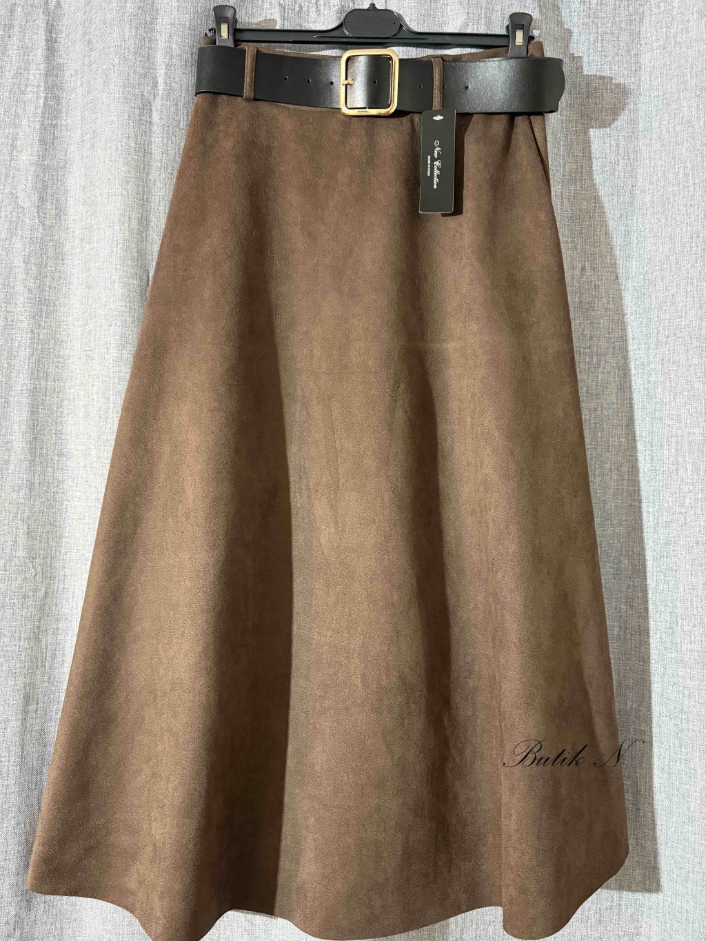 Krásná sukně ve třech barevných provedení, z velmi příjemného materiálu (naomak semiš), s gumou v pase a páskem.