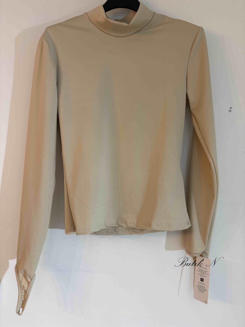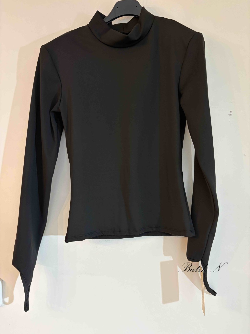Elastické tričko a ramenními vycpávkami a poutkem na prst na rukávech.