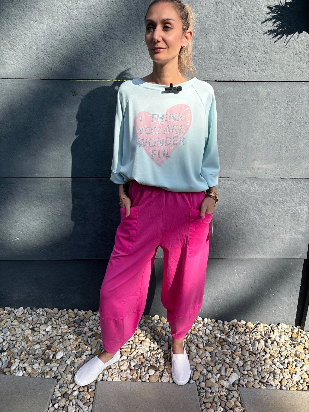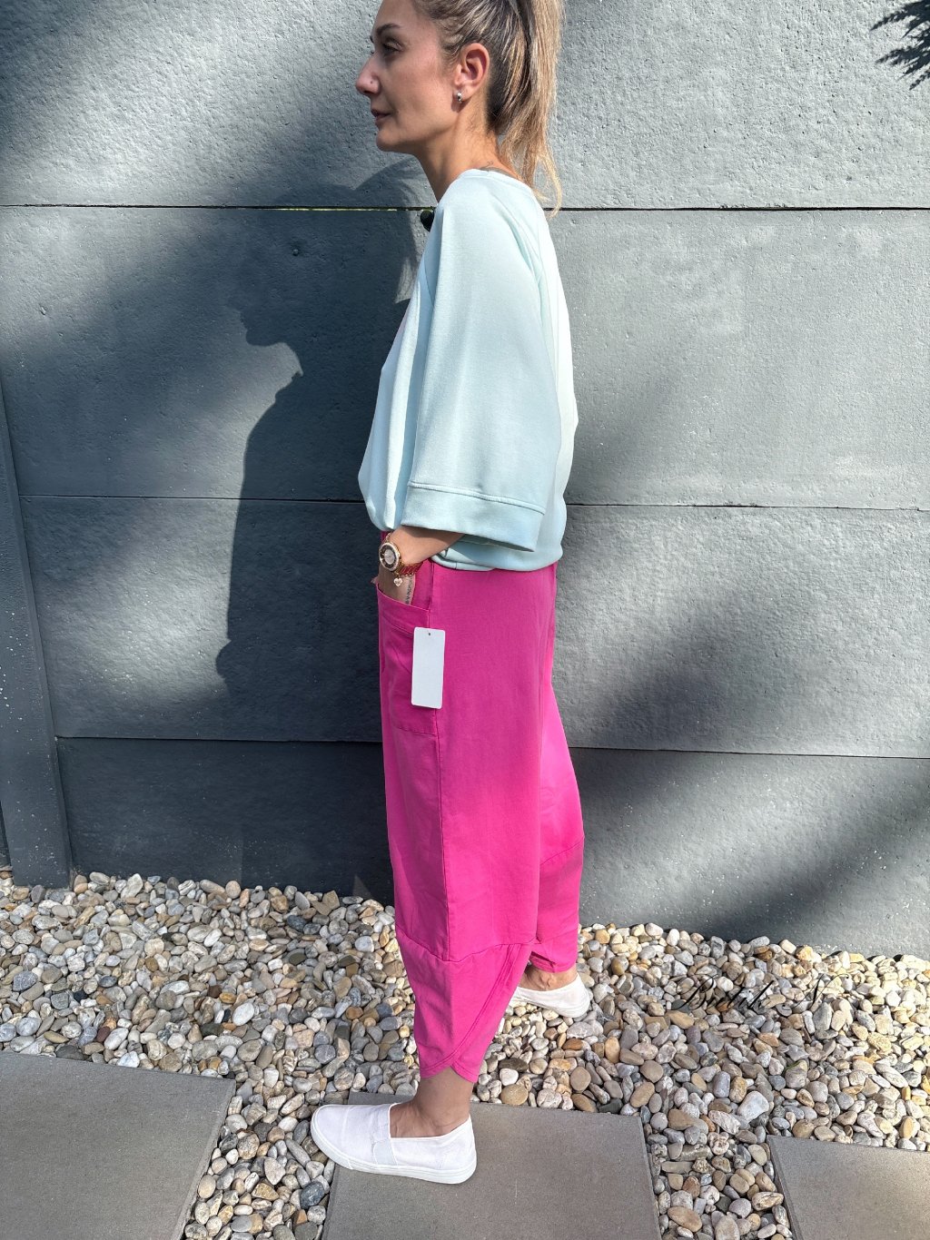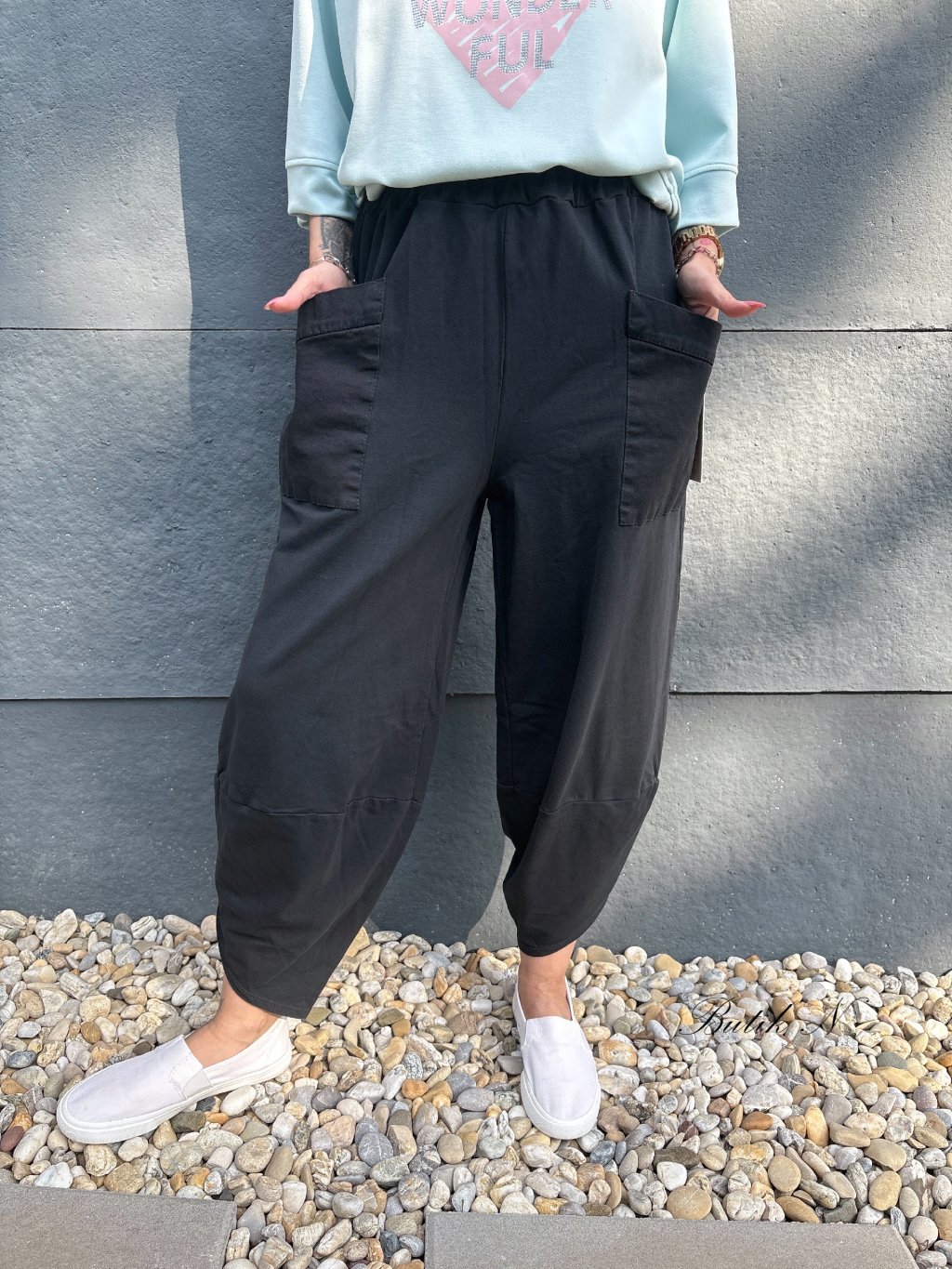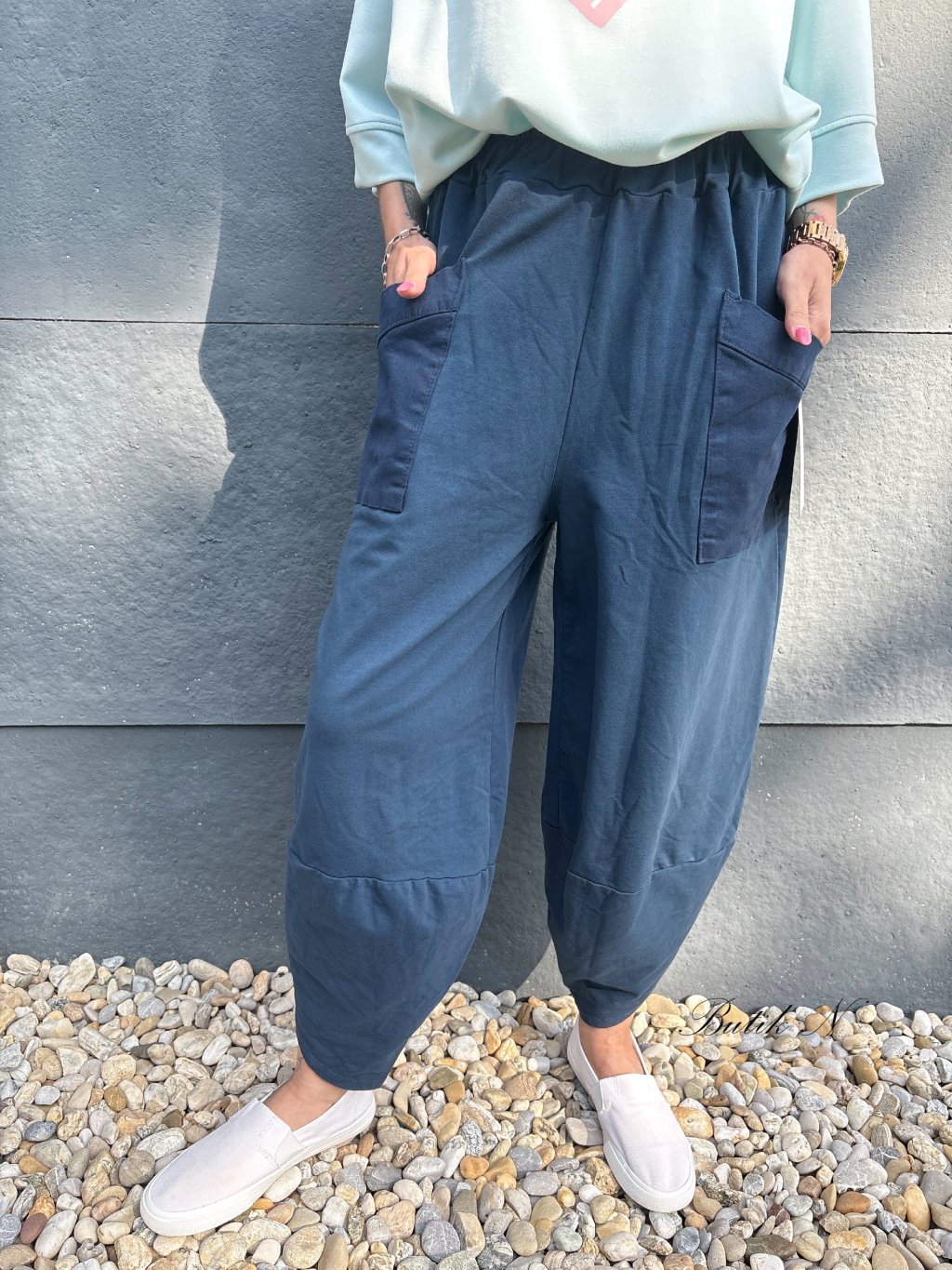Krásné, bavlněné kalhoty z kvalitního materiálu (teplákovina). V pase mají gumu a dvě velké přední kapsy.